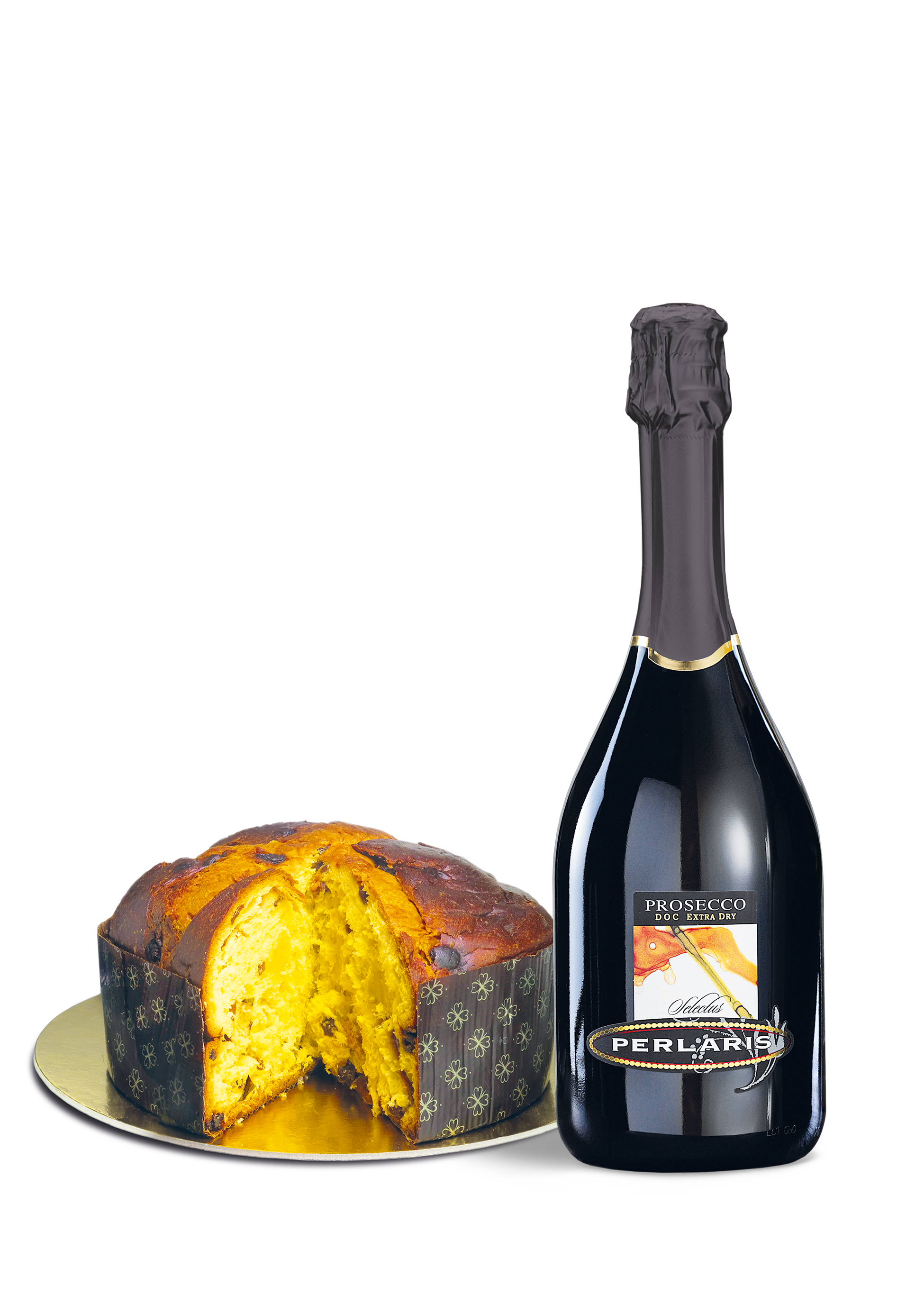 Accanto al panettone troviamo una bottiglia di Perlaris Prosecco DOC Extra Dry (750 cl), un vino frizzante che incanta con il suo gusto fresco e leggermente dolce. Idea regalo perfetta per celebrare le prossime festività.
