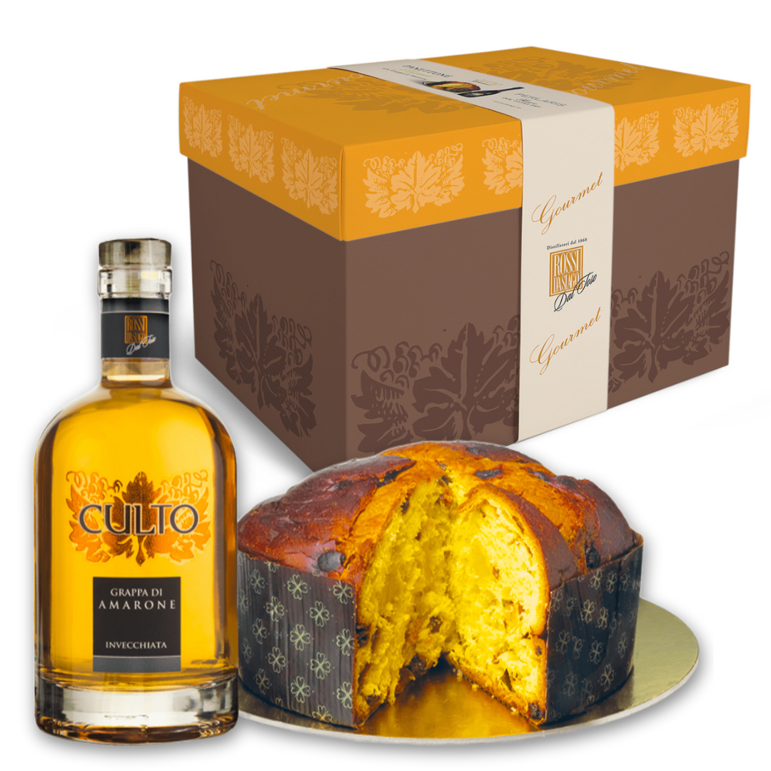 Ad accompagnarlo, una bottiglia di Grappa Culto di Amarone invecchiata, distillata con cura dalle vinacce del celebre Amarone della Valpolicella. Dopo 12 mesi di riposo in barrique di rovere, questa grappa si arricchisce di un bouquet aromatico complesso e un gusto caldo e avvolgente, con delicate note di uve mature, vaniglia e legni pregiati.